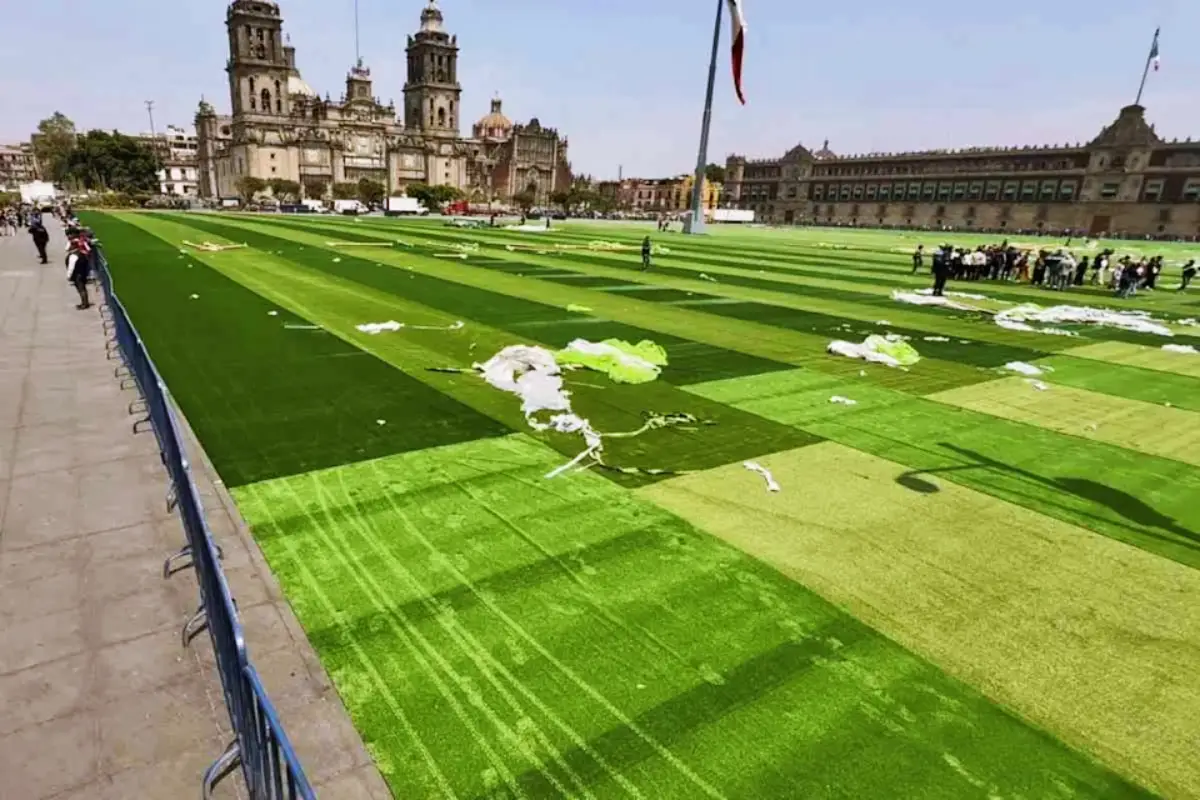 La protesta ocurrió pese a que la Plaza de la Constitución se encuentra cubierta con césped artificial, como parte de la preparación para la “Clase de Futbol más Grande del Mundo”, evento con el que el gobierno capitalino busca romper un Récord Guinness.