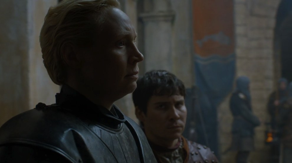 La bandera Tully tras Brienne y Pod sugiere que, de igual forma que las tropas de los Lannister y Jaime, estos se encuentran en Aguasdulces. Así que Brienne y Jaime van a verse otra vez y enamorarse, ¿cierto? Hmm.