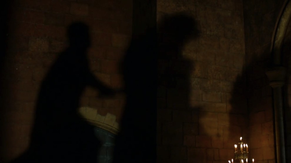 Actualización: Gracias a James Cully en los comentarios ahora tenemos una (muy emocionante) idea de lo que esto podría ser. La sombra de la izquierda se parece mucho a Jaime, mientras que a la derecha puedes ver la sombra del Trono de Hierro. ¿Es este un flashback del momento en que Jaime asesinó al Rey Loco Aerys todos esos años atrás? Por los dioses antiguos y nuevos, sin duda esperamos eso.