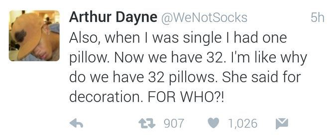 “También, cuando estaba soltero tenía una almohada. Ahora tenemos 32. Me pregunto por qué tenemos tantas almohadas. Ella dice por decoración. ¿PARA QUIÉN?