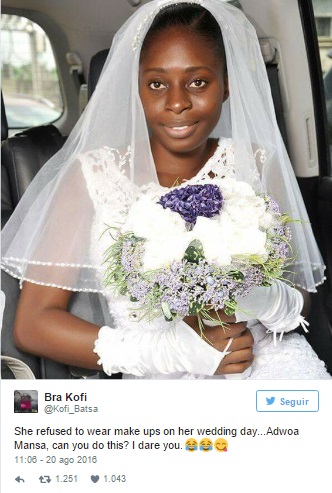 Aunque se desconoce su identidad y nacionalidad, la mujer bien podría imponer una tendencia y casi reto para muchas, pues es la primera en atreverse a llegar el día de la boda completamente a cara lavada, ¡no cualquiera verdad!