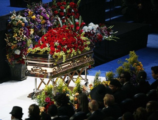 The casket is pictured during memorial services for pop star Michael Jackson in Los Angeles July 7, 2009. Michael Jackson's family and close friends held a private service at a Los Angeles cemetery on Tuesday as fans crowded into the city's downtown area for a star-packed public memorial to the "King of Pop."    REUTERS/Mario Anzuoni (UNITED STATES OBITUARY ENTERTAINMENT IMAGES OF THE DAY)