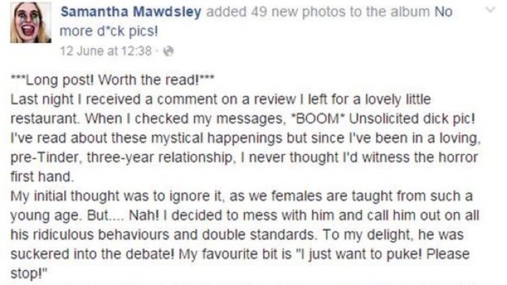 “He leído sobre estos místicos acontecimientos pero como llevo tres años en una relación previa a la ‘era Tinder’ (una aplicación de citas) nunca pensé que viviría este horror en primera persona“, se lee en el comienzo del irónico post de Samantha en Facebook que iba acompañado por la foto que el tipo le envío, aunque censurada.