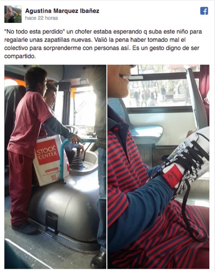 En Córdoba, Argentina, en un bus de la línea 1o, el chofer a cargo decidió regalarle un par de zapatillas nuevas a un niño que se subió. El acto es notable, pero la sonrisa de agradecimiento del pequeño es lo más inspirador y pagable que puede haber sucedido. Así lo pensó Agustina, quien tomó fotografías del momento y las publicó en su perfil de Facebook, en las que abundaron los buenos comentarios hacia el chofer.