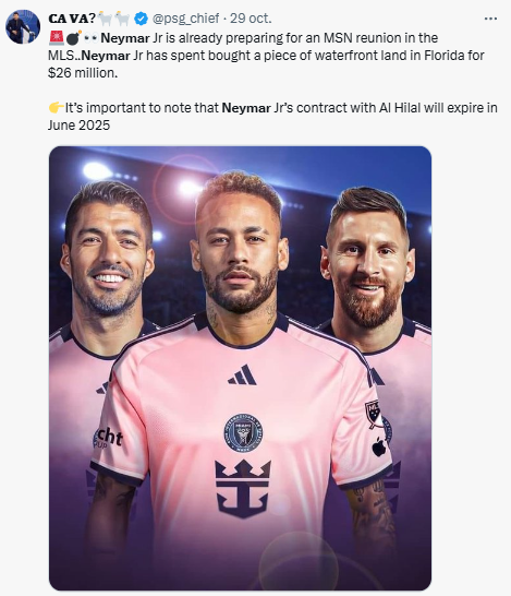 ¿Neymar se reunirá con Messi y Luis Suárez? El rumor de que podría fichar por el Inter Miami anda bastante fuerte. Resulta que todo eso se desató porque el brasileño compró una casa en Miami y la imaginación de la afición comenzó a volar.