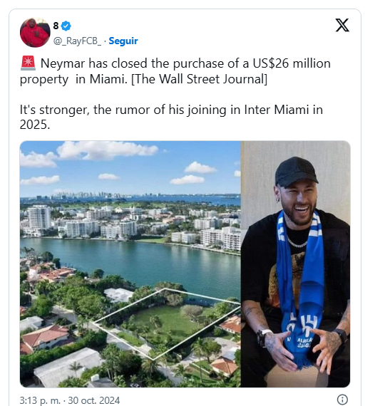 Neymar compró una mansión en Miami y desata rumores de reunirse con Messi y Suárez en el Inter