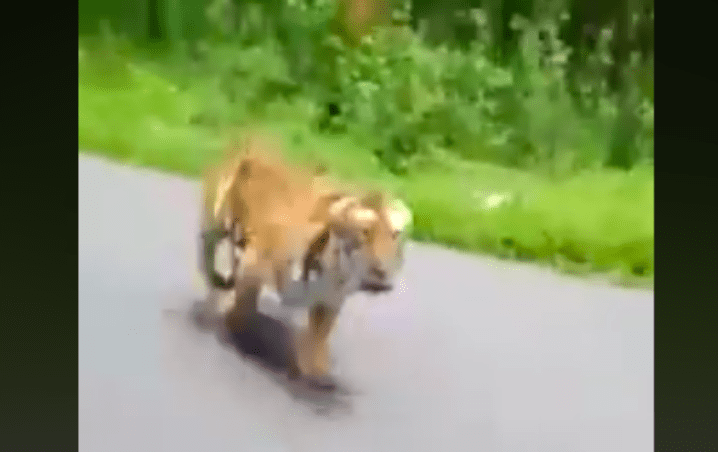 Solo alcanza a grabar el momento exacto donde entre el conjunto de arboles y la maleza verde abundante sale de la nada un tremendo Tigre de Bengala.