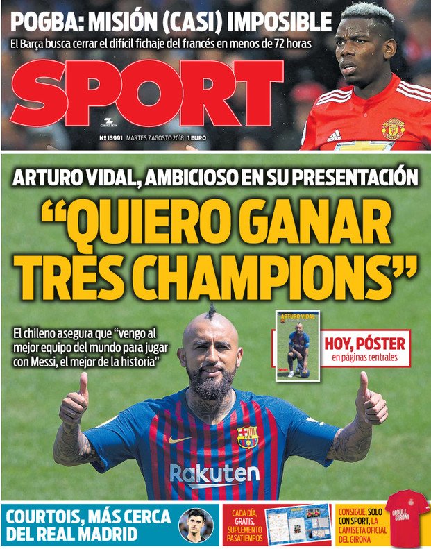 BARCELONA.— Incapaz de ganar un título de la Champions como jugador de la Juventus y el Bayern Múnich, Arturo Vidal busca hacerlo finalmente con el Barcelona. Si bien el mediocampista chileno formó parte de los planteles del Bayern que fueron eliminados por el Real Madrid en las últimas dos campañas, aseguró que no tiene nada qué demostrar ante el mayor rival de su nuevo club. “No sé si tengo cuentas pendientes con el Madrid, pero sí con mi objetivo que es ganar la Champions”, declaró Vidal. “Espero cumplir con eso aquí. Cuando nos toque el Real Madrid, entonces ya veremos”, manifestó.El Bayern fue eliminado por el Madrid en los cuartos de final de la Champions en 2017 y en las semifinales de 2018. A principios de este año, Vidal manifestó su frustración a través de las redes sociales al señalar que el equipo español era favorecido por decisiones arbitrales cuestionables. “No soy antimadridista”, aseveró el jugador de 31 años. “Yo soy rival de todos los que juegan contra el Barça de aquí en adelante. No tengo ningún enemigo. Pero el que se enfrente al Barça, será es mi rival”. En 2016, el Bayern fue eliminado por el Atlético de Madrid en las semifinales de la Champions. Vidal se unió al Bayern procedente de la Juve en 2015, poco después que el club italiano perdiera la final de la Champions ante el Barcelona. La Juventus y Vidal llegaron hasta cuartos de final de la competencia europea en 2013, donde cayeron frente al Bayern. El mediocampista fue uno de los jugadores clave de la selección de Chile que se coronó en la Copa América en 2015 y 2016. También formó parte del conjunto chileno que terminó como subcampeón, tras caer con Alemania, en la Copa Confederaciones que se disputó el año pasado en Rusia. El Barcelona fichó también a los brasileños Arthur y Malcom, así como al defensor francés Clément Lenglet, mientras que los españoles Andrés Iniesta y Gerard Deulofeu, el brasileño Paulinho y el francés Lucas Digne abandonaron al conjunto catalán. Ivan Rakitic, Samuel Umtiti, Luis Suárez, Philippe Coutinho, Yerry Mina y Thomas Vermaelen se reincorporaron al Barsa, después de participar en la Copa del Mundo. Lionel Messi, Sergio Busquets, Gerard Piqué, Jordi Alba y Ousmane Dembélé de antemano se habían reportado con el club. El Barcelona será el campeón defensor de la Liga española. leer más