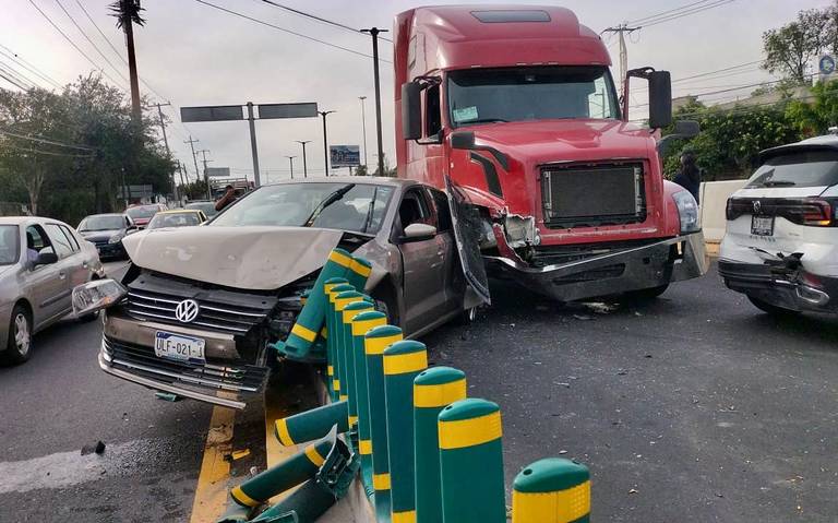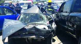 QUERÉTARO.— Una aparatosa carambola entre cuatro vehículos se registró en la avenida 5 de Febrero, a la altura de la empresa Tremec; el saldo fue de tres personas lesionadas y cuantiosos daños materiales.Cerca de la 1:00 de la tarde de ayer, el conductor de una camioneta Chevrolet Silverado verde avanzaba sobre los carriles centrales en dirección a Querétaro.De pronto, frenó de manera imprevista a unos metros de la incorporación de laterales a centrales, por lo que detrás de él se impactó un Nissan Tsuru gris. Enseguida, el chofer de una revolvedora de la empresa Holcim no pudo detenerse y trató de esquivar los vehículos, pero alcanzó a golpearlos y proyectarlos. En la maniobra, también chocó contra un Nissan Versa, el cual hizo que se subiera al muro de contención.Policías estatales llegaron al sitio y apoyaron para facilitar el acceso de los cuerpos de emergencias.Tras una valoración, se determinó que los pasajeros no presentaban lesiones de gravedad. leer más