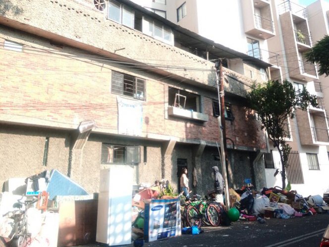 Los inconformes agredieron a las atoridades arrojando objetos desde las ventanas; frente al inmueble en obra negra, se aprecian cosas pertenecientes a los desalojados.