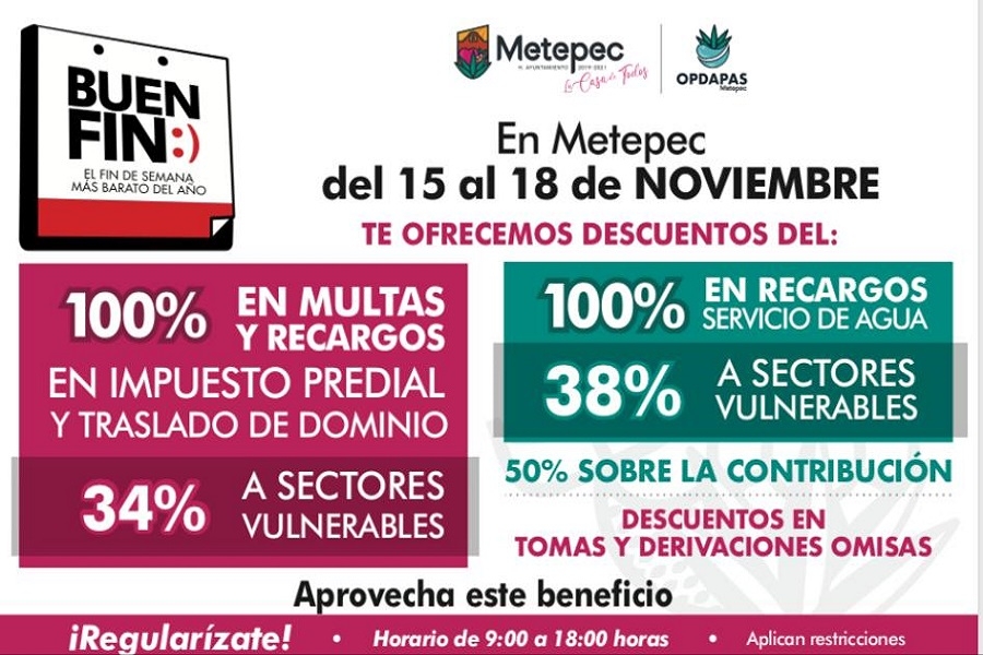 Metepec, Méx.- En el marco del Buen Fin, el Ayuntamiento de Metepec lanzó una atractiva campaña de regularización del impuesto predial que ofrece una bonificación del 50% en adeudos correspondientes a 2023 y años anteriores, además de la condonación total de multas y recargos.