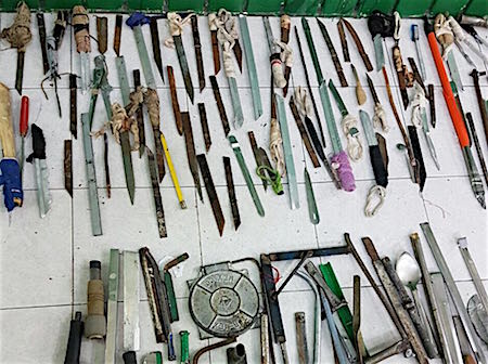 Durante el operativo de revisión realizado anoche fueron hallados 155 pedazos de metal en forma de punta, 97 pica hielos, 85 gurbias (navaja en forma de cuneta para realizar grabados en madera), 3 navajas, 4 cuchillos, 22 martillos artesanales, 53 tijeras, 42 pedazos de metal sin punta, 28 arcos de metal, 33 cubiertos metálicos, 35 garrotes de madera, 133 palos, 8 planchas, 1 licuadora, 1 laptop, 10 parrillas, 1 radio grabadora, 10 mp3, 12 bocinas, 1 grabador de discos, 2600 discos pirata, 2 DVD y 32 mil 486 pesos en efectivo.