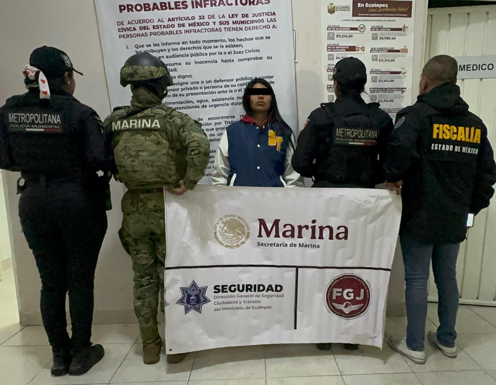 Ecatepec, Méx.- Elementos de la policía municipal con respaldo de Marina detuvieron a una mujer quen contaba con orden de reaprehensión por robo agravado en la Ciudad de México (Cdmx), a quien entregaron a la Fiscalía General de Justicia del Estado de México (FGJEM).