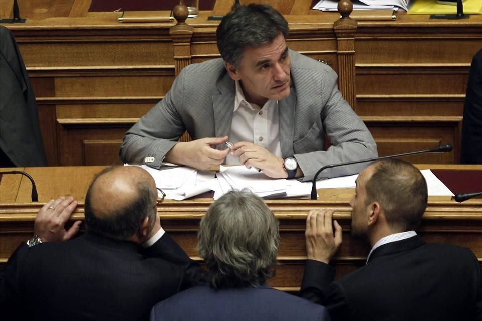 | El Ministro de Finanzas griego, Euclid Tsakalotos, conversa con los legisladores durante la sesión parlamentaria sobre la nueva propuesta en Atenas, Grecia. Foto: EFE |