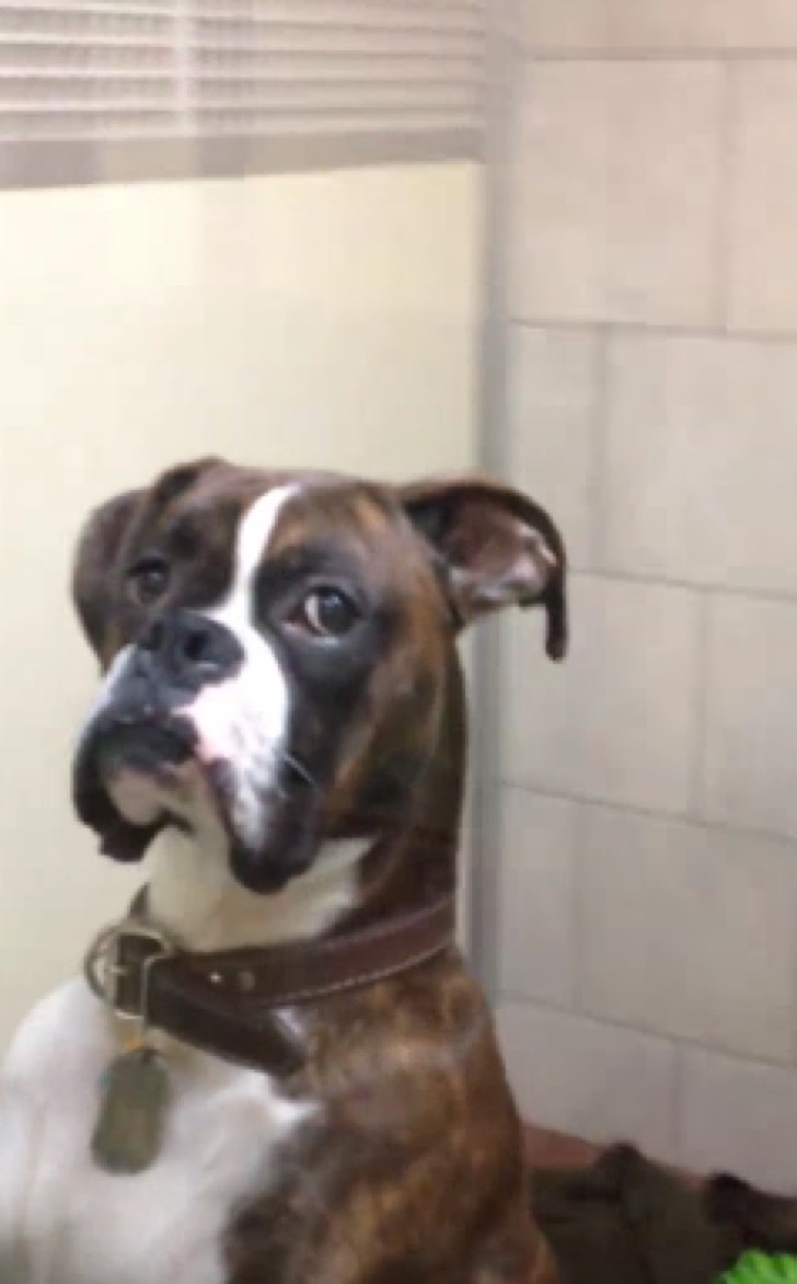 En este caso, vemos a un bóxer llamado Chops con una mirada muy disgustada ¿la razón? Pues su dueño lo había llevado al veterinario momentos antes y él no estaba muy contento por eso.