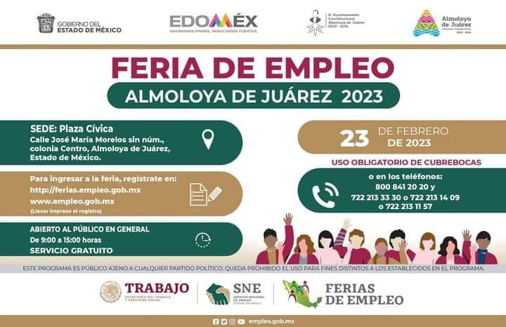 Almoloya de Juarez, Méx.- Con el objetivo de impulsar la inserción laboral y fortalecer la economía local, se llevará a cabo una Jornada de Empleo en el municipio de Almoloya de Juárez, donde empresas privadas ofertarán diversas vacantes para personas que buscan incorporarse al sector productivo.