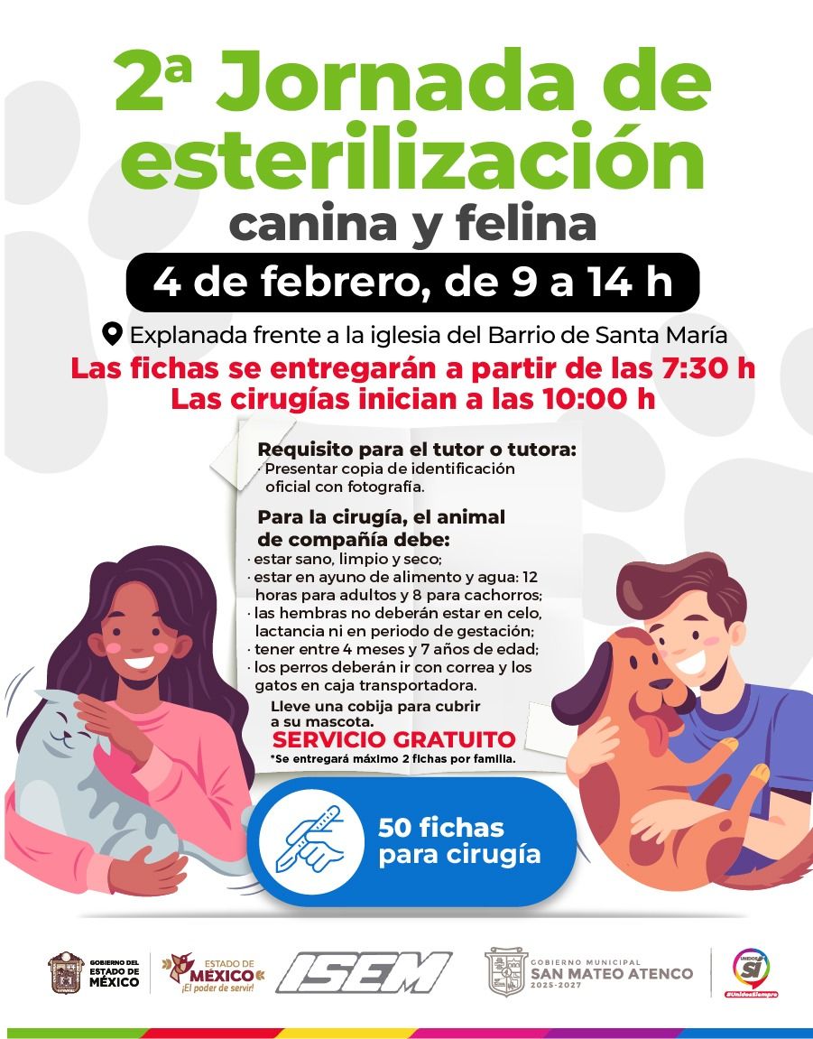 San Mateo Atenco, Méx.– Con el objetivo de fomentar el bienestar animal y la tenencia responsable, el Gobierno Municipal de San Mateo Atenco llevará a cabo la Segunda Jornada de Esterilización Canina y Felina, un servicio gratuito dirigido a la población del municipio.