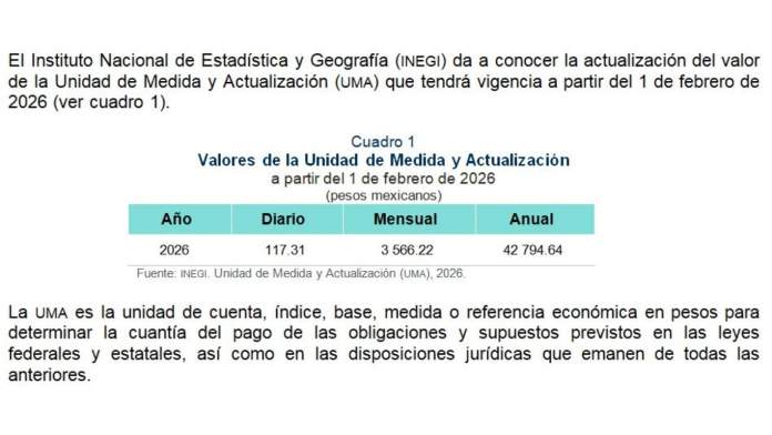 Ciudad de México.- La UMA 2026 quedó establecida en 117.31 pesos diarios, luego de que el Instituto Nacional de Estadística y Geografía informó el ajuste anual basado en la inflación registrada en diciembre de 2025.