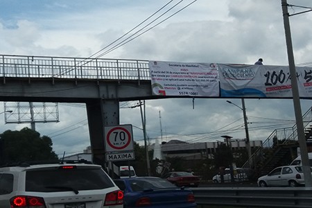 “Aviso: A partir del 30 de mayo, todo el transporte público que circule por carriles centrales será remitido al corralón y se aplicará una multa de 35 mil pesos. Ciudadano, ayúdanos enviando fotos por WhatsApp al teléfono 5574110061”, dicen mantas colocadas en puentes peatonales de Periférico Norte.