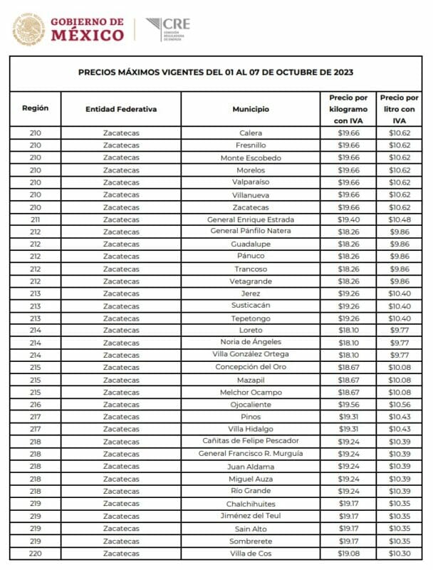 La Comisión Reguladora de Energía ha publicado los precios máximos del gas vigentes del 8 al 19 de octubre de 2023 en todas las regiones de Zacatecas.