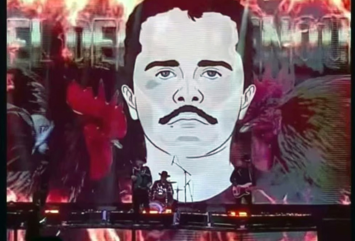 En este acto se incluyeron canciones como “El Dueño del Palenque”, en la que se proyectaron fotografías del líder del cártel de las cuatro letras, una de ellas pertenece al arresto del capo en Estados Unidos, durante los años 80.