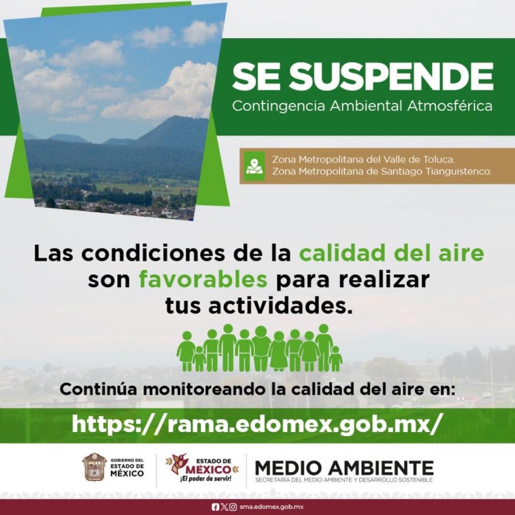 Toluca.-El Gobierno del Estado de México suspendió la Contingencia Ambiental Atmosférica Fase I el 26 de diciembre en las Zonas Metropolitanas del Valle de Toluca y Santiago Tianguistenco.