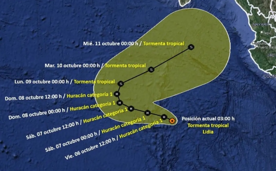 La tormenta tropical Lidia causará fuertes lluvias en Baja California Sur. Según el Servicio Meteorológico Nacional (SMN), se espera que la tormenta también incremente la posibilidad de lluvias muy fuertes a intensas en Sinaloa, Nayarit, Jalisco y Colima.