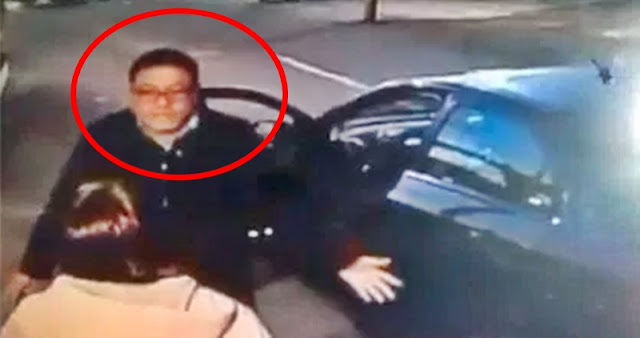 Sin embargo, luego de que intercambiaran palabras, el hombre sube a su auto para salir de inmediato y tirar a la mujer de una patada.