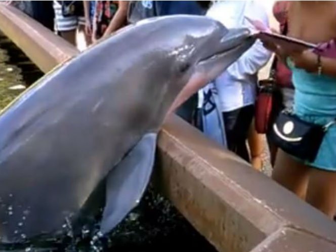 En los altavoces se escucha una voz que dice: “Como ven, los delfines pueden agarrar tus objetos sueltos”.