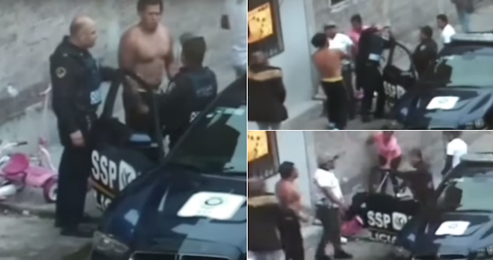 En las escenas se observa a un hombre sin playera que se acercó, reclamó y comenzó a tocar al oficial que terminaría en el piso.