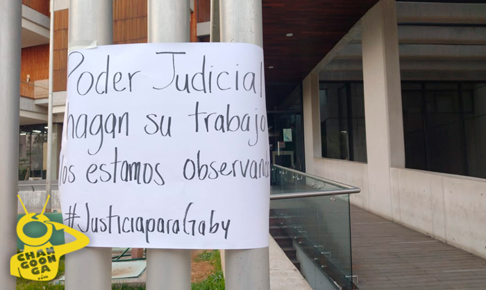 Al término de la primera audiencia de alegatos del juicio oral por el feminicidio de Gaby se pudieron observar algunas cartulinas que fueron pegados por mujeres en la reja del Supremo Tribunal de Justicia.